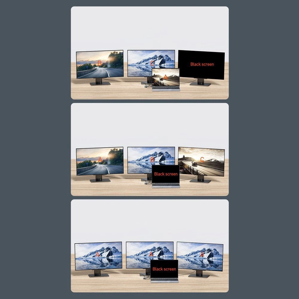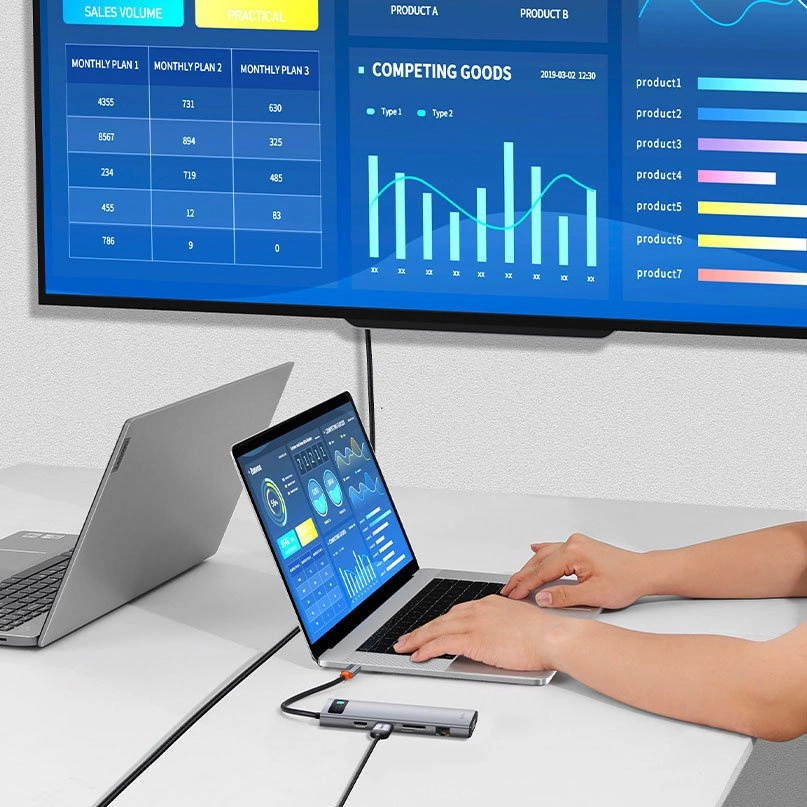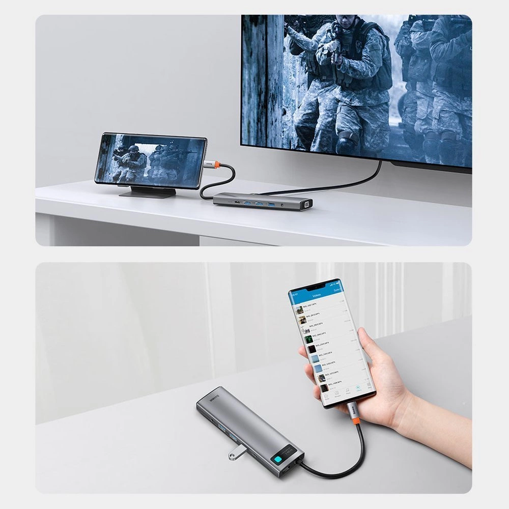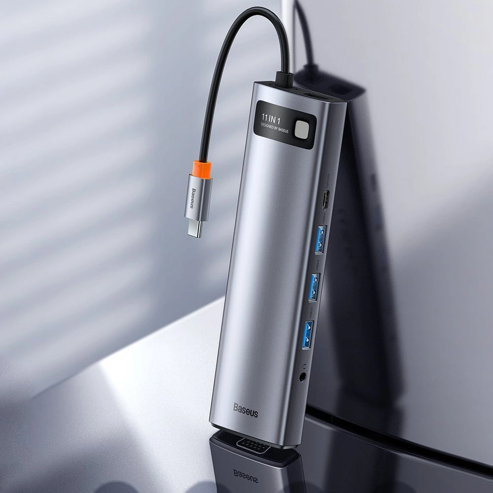 Teljes körű csatlakozási lehetőséget kínál a Baseus Metal Gleam 11in1 HUB, amely egyetlen USB-C portból tizenegyféle bővítést biztosít. Akár két monitorhoz is csatlakozhatsz 4K HDMI-n keresztül, egyidejűleg SD és microSD kártyát olvashatsz be, hálózati RJ45 porton keresztül gyors internetet használhatsz, és még fejhallgatót is csatlakoztathatsz a 3,5 mm-es jack aljzaton keresztül. Kompakt, mégis erőteljes megoldás laptopodhoz, otthonra és irodába egyaránt.