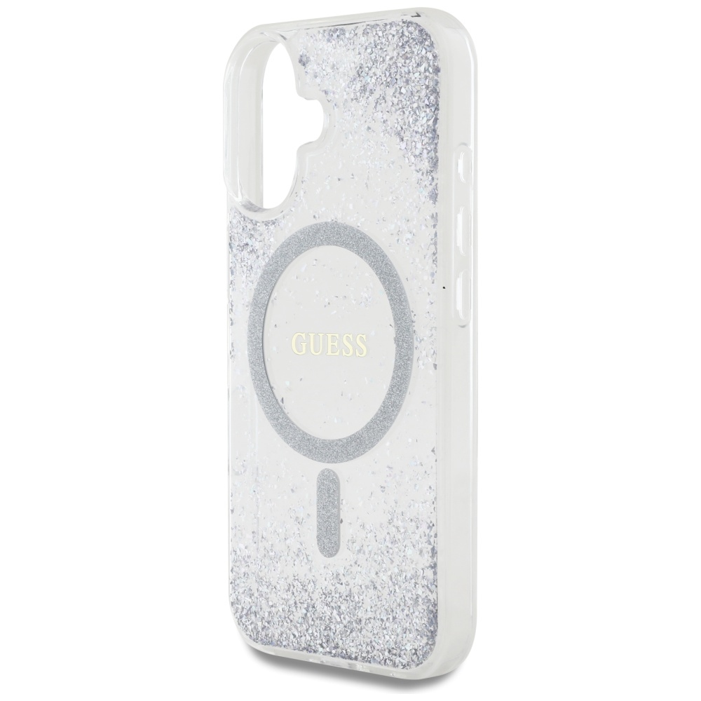 A Guess HC Resin Bottom Glitter MagSafe tok elegáns csillogó dizájnt kínál, amelyet a középen elhelyezett Guess logó és a fényes MagSafe gyűrű tesz igazán különlegessé. A folyékony glitter minden mozdulatra megcsillan, így a tok látványos és divatos kiegészítővé válik.