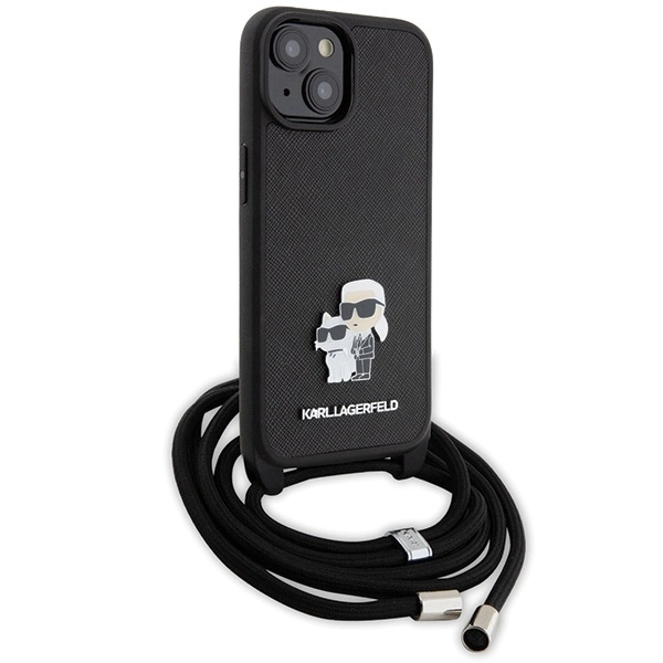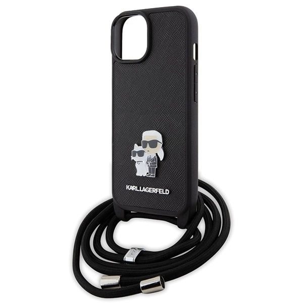 Ez a fekete Crossbody Saffiano Metal Pin tok iPhone 15-höz vállpánttal és Saffiano textúrával készült, hogy mindig kéznél tudd tartani a telefonod. A fém Karl logó elegáns megjelenést kölcsönöz, a merev borítás pedig biztonságos védelmet nyújt a készüléked számára.