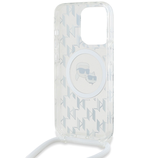 Átlátszó, divatos és praktikus tok monogram mintával, Karl & Choupette grafikával, MagSafe-kompatibilitással és kényelmes crossbody pánttal. Stílusos védelem szabad kézhasználattal.